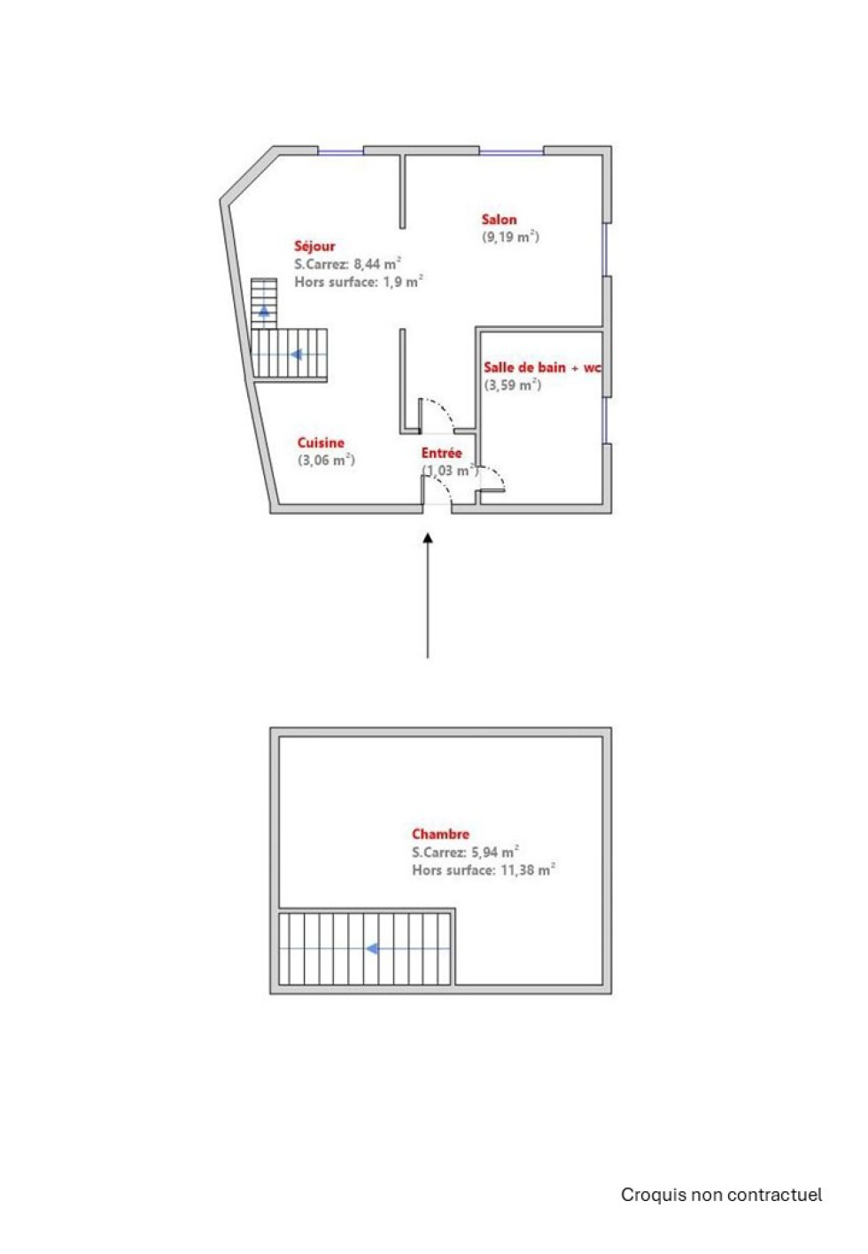 Situé au 2ᵉ et dernier étage (sans ascenseur), l’appartement se compose d’une entrée, d’une cuisine indépendante, d’un salon, d’un séjour, d’une salle de bains avec WC, ainsi que d’une chambre en duplex, offrant un espace nuit cosy.