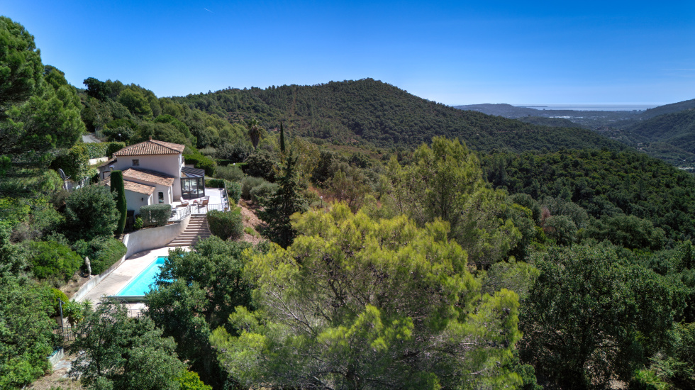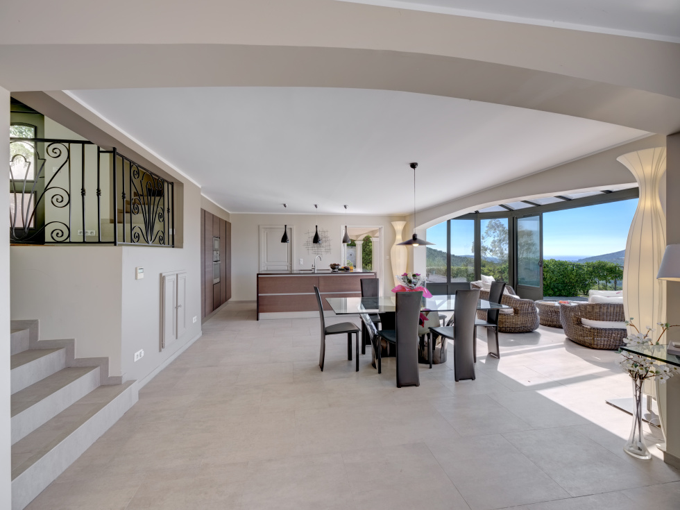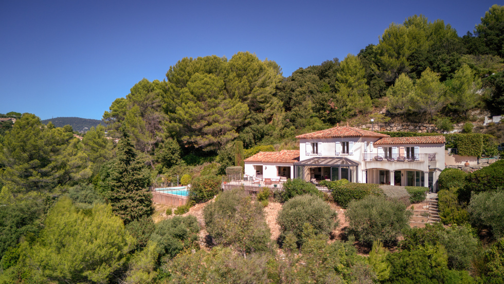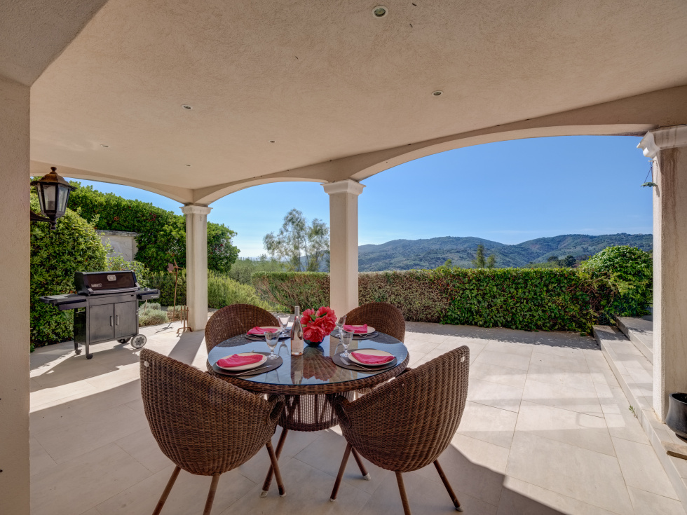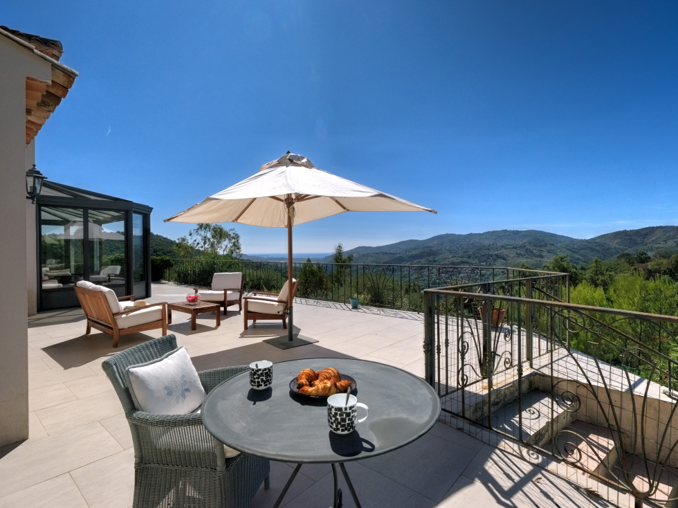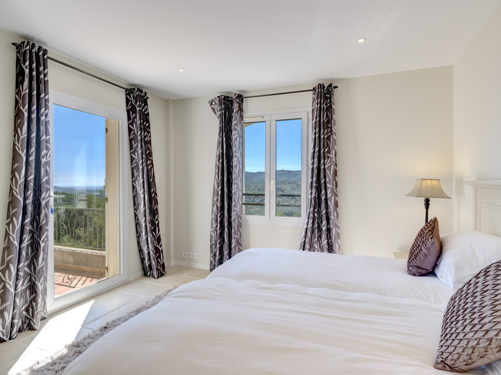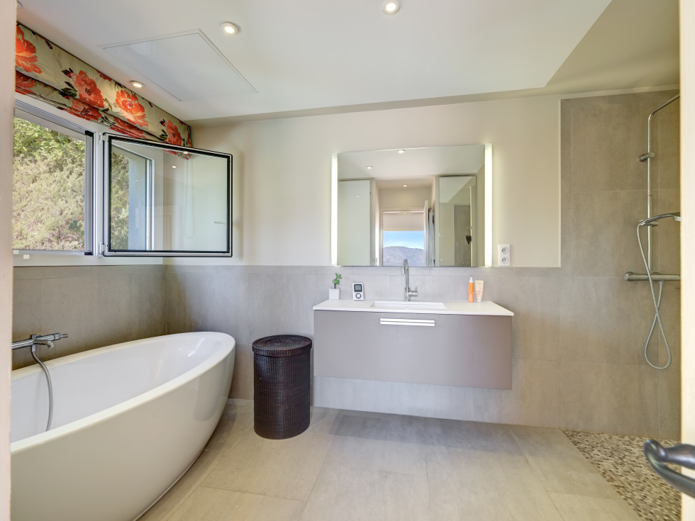 Peaceful surroundings, pure nature, and gorgeous views… These are ever increasingly luxury aspects of a property, especially if located in good distance to shops and restaurants. This modern and turn-key home is one of these rare finds. Fully airconditioned and equipped to high standards, the villa offers 4 bedrooms, including a master bedroom suite, and a very spacious living area with open kitchen. Each room takes in the sweeping views of the valley down to the Mediterranean Sea.